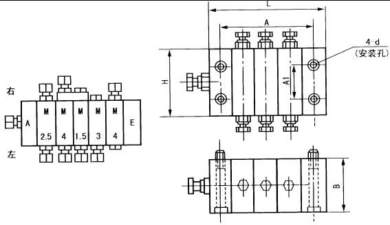 說(shuō)明:遞進(jìn)分配器的組合按進(jìn)油口元件首塊A、工作塊M和尾塊E、從左到右排列,在隊(duì)列下方出口稱為左,在隊(duì)列上方出口稱為右。如圖